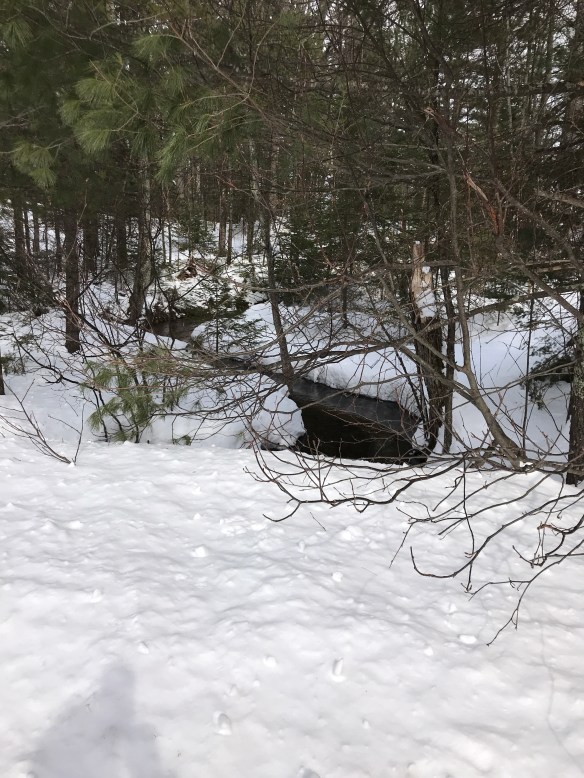 Well, don’t get too excited, folks; it’s just the Blue Lake outlet. I took a walk down Hacker the other day and it sure was nice to hear the water flowing. Never mind that there is still a foot and a half of snow and who knows how many inches of ice on the lake! I’m pretty sure it will be June before the mountain of snow at the end of my driveway melts away.